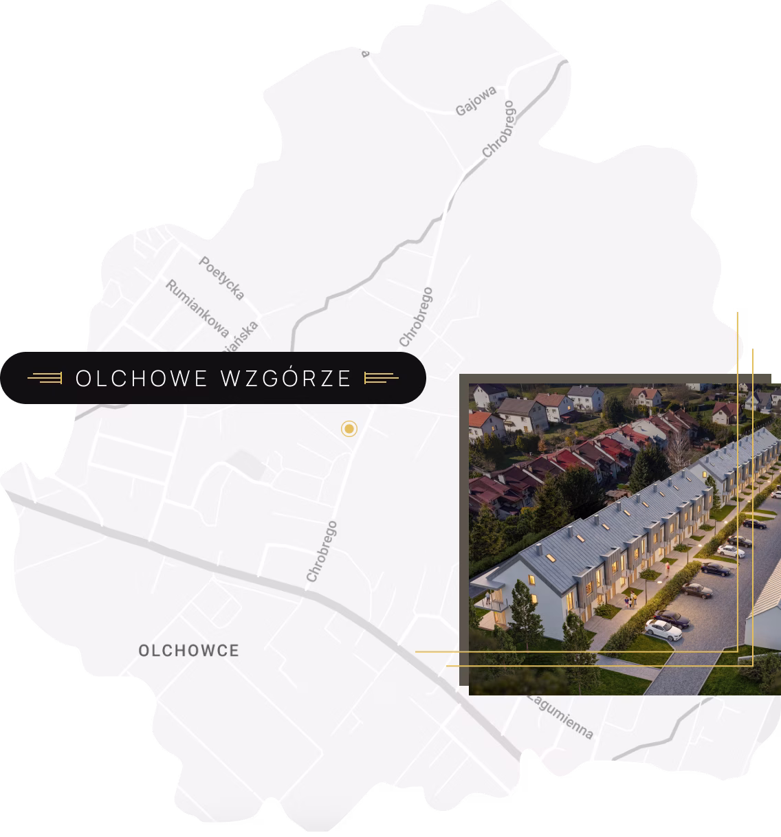 Olchowe Wzgórze to spokojna, elegancka zabudowa szeregowa z domami jedno- i dwurodzinnymi. Zapewnia prywatność i ciszę, a jednocześnie wygodny dostęp do miejskiej infrastruktury.